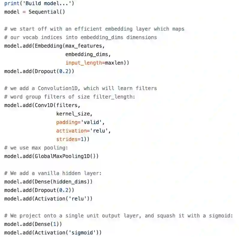 不过,从实作面的角度来看,透过Keras,CNN的原理也不是太重要,只要找对API即可 (Conv1D)。在以下这个实作范例中,大约需要20行的代码,即可建出这个model: