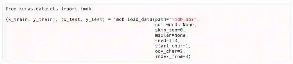 2. Keras 已安装完毕,则 IMDB 可由此方式入手(https://keras.io/datasets/) 。此API的底层:https://github.com/fchollet/keras/blob/master/keras/datasets/imdb.py