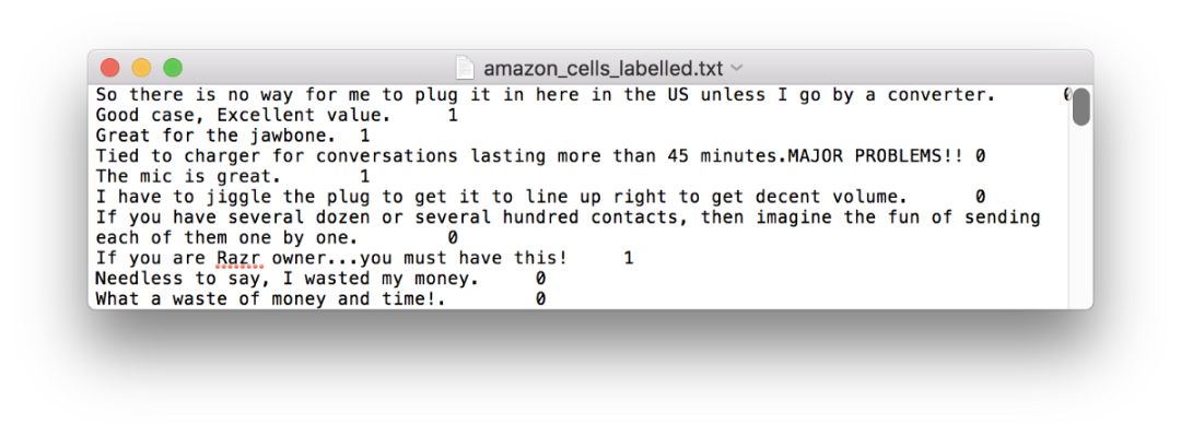 所有数据都已经过注释,0 表示消极反馈,1 表示积极反馈。亚马逊的数据与下图相似。