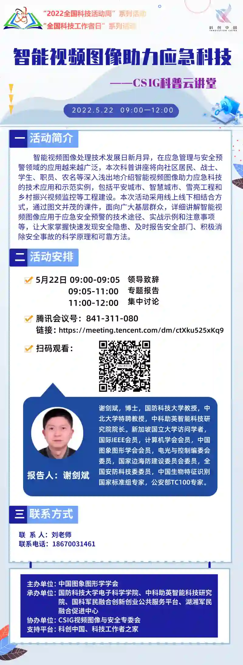智能视频图像处理技术发展日新月异,在应急管理与安全预警领域的应用越来越广泛,本次科普讲座将向社区居民、战士、学生、职员、农名等深入浅出地介绍智能视频图像助力应急科技的技术应用和示范实例,包括平安城市、智慧城市、雪亮工程和乡村振兴视频监控等工程建设。本次活动采用线上线下相结合方式,通过图文并茂的课件,面向广大基层群众,详细讲解智能视频图像应用于应急安全预警的技术途径、实战示例和注意事项等,让大家掌握快速发现安全隐患、及时报告安全部门、积极消除安全事故的科学原理和可靠方法。