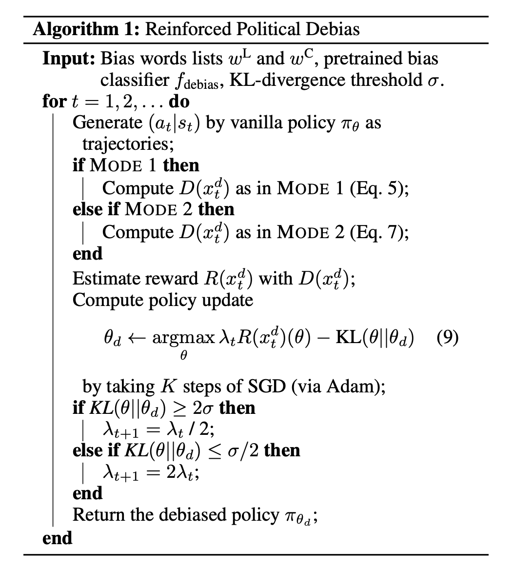 Main Contribution: 描述了衡量 GPT-2 生成任务种政治偏见的指标,并提出了一个基于强化学习 (RL) 的框架来减轻生成文本中的政治偏见,该框架不需要访问训练数据或者重新训练模型 。