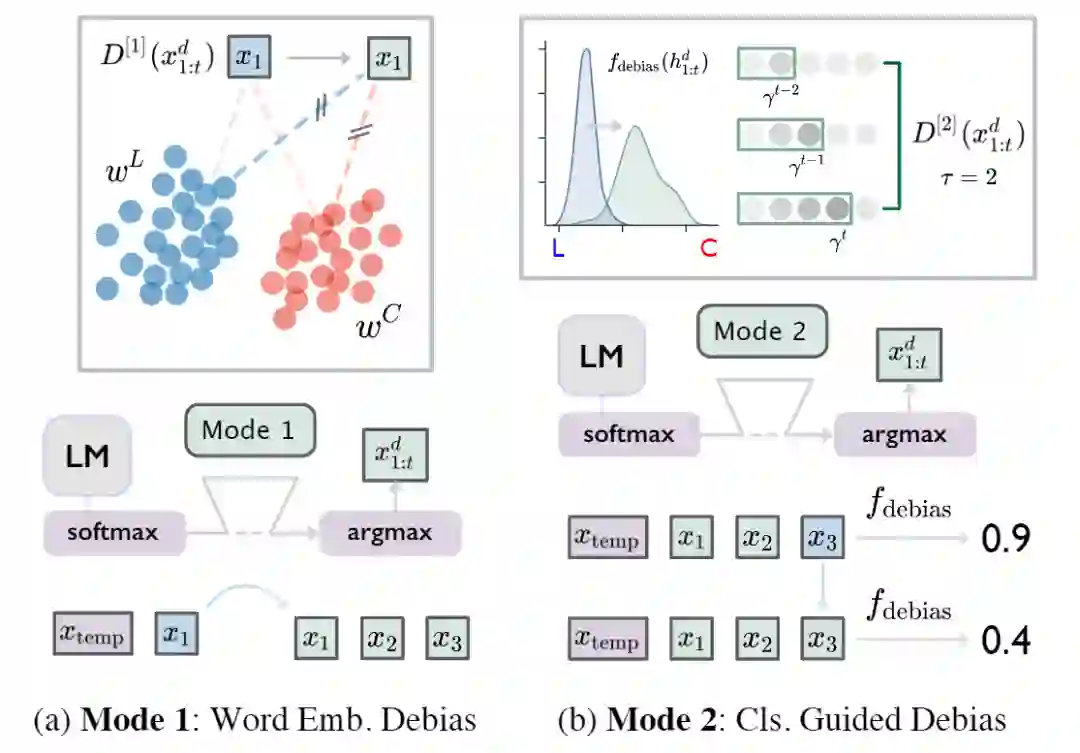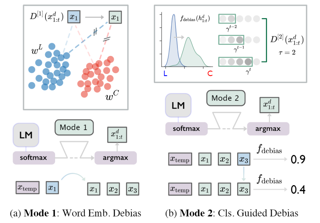 有了这些 metric,接下来的问题就是如何减小它们了。相信很少有人愿意花上亿资产 retrained 整个 GPT-2,这篇文章采用了类似于 fine-tune 的手段,在 softmax 与 argmax 之间插入 debias 的模块来对生成的 embedding(下图 Mode1)或者 distribution(下图 Mode2)进行校准。