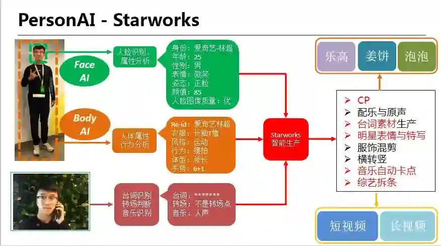这个功能涉及到的技术主要包括人脸识别、人脸表情等属性识别、场景识别、服饰和职业识别、台词 OCR、NLP、声音和音乐检测、音乐节拍点提取、镜头切分、专场特效、视频滤镜等模态。