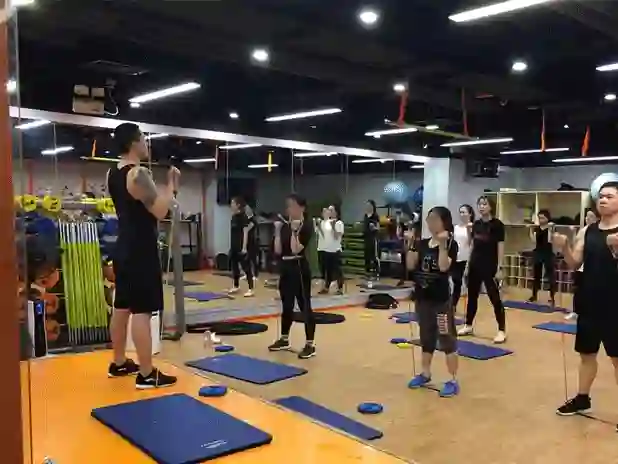 环境:大厦一层底商,面积约200平,主色调为橘黄色。进门处有一条长板凳供人休息。只有一个团操教室,五六个更衣室,二十个储物柜,一个卫生间,没有淋浴间,整体感觉场地有点拥挤。每次教室最多可容纳20人上课。教室里有杠铃、瑜伽球、瑜伽垫、哑铃、战绳等轻便设备,没有大型设备。
