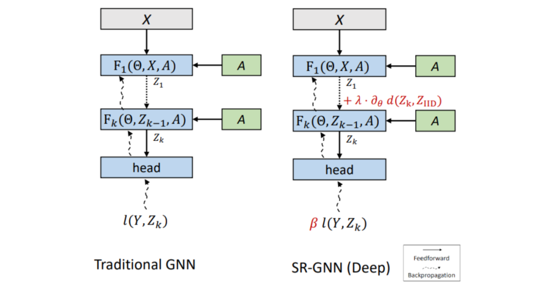 下图所示为SR-GNN与传统GNN模型的对比。二者输入相同,层数相同。将GNN的第(k)层的最终嵌入Zk与来自未标记的数据点的嵌入进行比较,验证该模型是否正确编码。