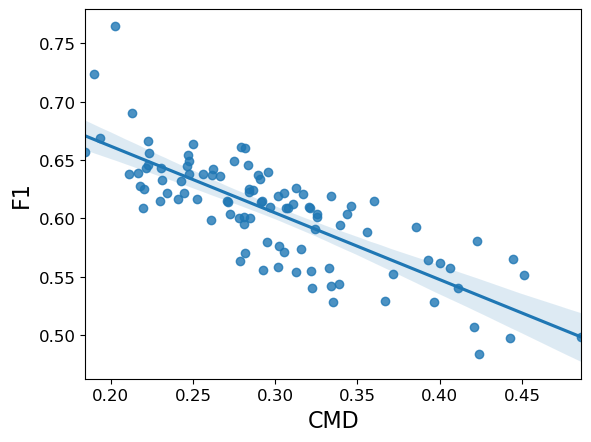可以看到,数据集的分布偏移与分类准确率之间存在着强烈的负相关:随着CMD的增加,性能(F1)显著下降。也就是说,GNN可能难以泛化,因为训练数据看起来不太像测试数据集。