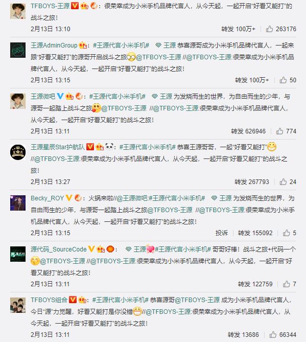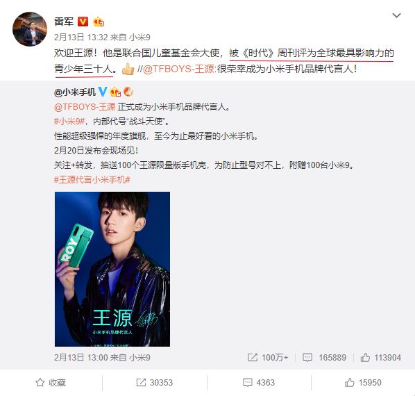 而最近,小米官方宣布王源正式成为小米手机品牌代言人,又一顶级流量明星加入了小米手机代言人行列。这条微博已发布,小米的官博就获得了三百万以上的转发量,王源的个人微博上的转发量也突破了两百万。
