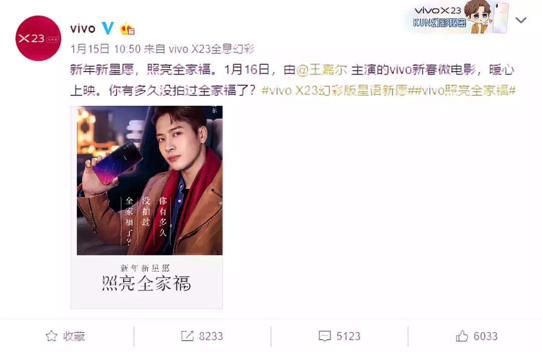 而手机的形象代言人也在宣传中起到了至关重要的任务,其实很多人都知道,很多明星都会代言手机品牌,而在明星使用微博的过程中就会带他们所用机型的小尾巴,这样一来就可以起到很好的宣传作用。而且明星的“人设”也会让用户对这一手机品牌定位产生判断。
