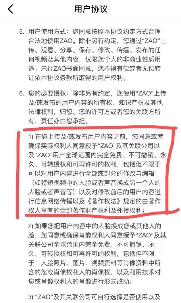根据ZAO用户协议内容中的必要授权协议:用户上传发布内容后,意味着同意授予ZAO及其关联公司以及ZAO用户在“全球范围内完全免费、不可撤销、永久、可转授权和可再许可的权利”,“包括但不限于可以对用户内容进行全部或部分的修改与编辑(如将短视频中的人脸或者声音换成另一个人的人脸或者声音等)以及对修改前后的用户内容进行信息网络传播以及《著作权法》规定的由著作权人享有的全部著作财产权利及邻接权利”。该项条款包括但不限于:人脸照片、图片、视频资料等肖像资料中所含的用户或肖像权利人的肖像权,以及利用技术对其肖像进行形式改动。