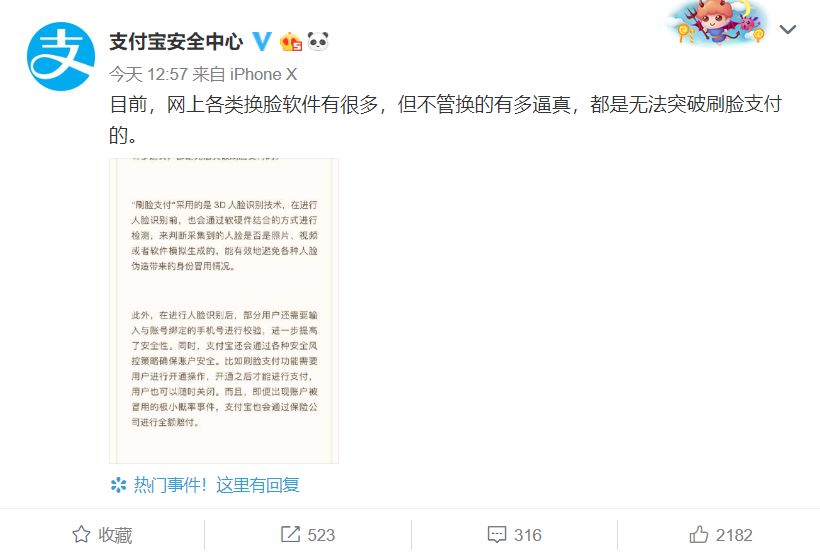 8月31日消息,支付宝安全中心对于网上热传的“AI换脸应用软件会威胁支付宝刷脸支付”作出回应,官方称:“目前,网上各类换脸软件有很多,但不管换的有多逼真,都是无法突破刷脸支付的。”