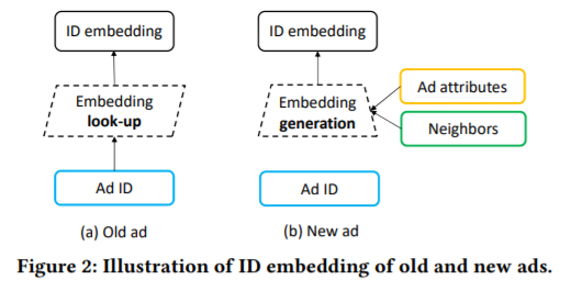 GME仅针对冷启动的商品,如上图所示,当广告进来后,进行查找,若能找到embedding,则为旧的,若找不到在进行GME来生成初始embedding。