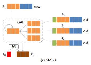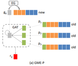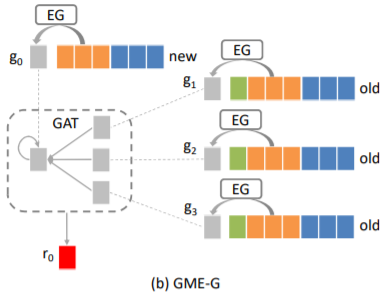 如图所示为GME-G的示意图。为了解决GME-P的缺陷,GME-G将新商品和邻居旧商品都通过EG结合对应的属性来得到他们的embedding。