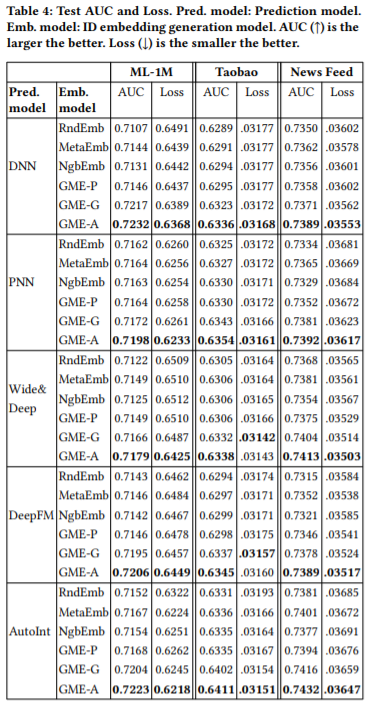 GME主要包含两个部分:EG(embedding generator)和GAT。EG用于生成id embedding,GAT用于蒸馏信息。从不同的角度分别提出了GME-P,GME-G,GME-A,GME-A效果最好。