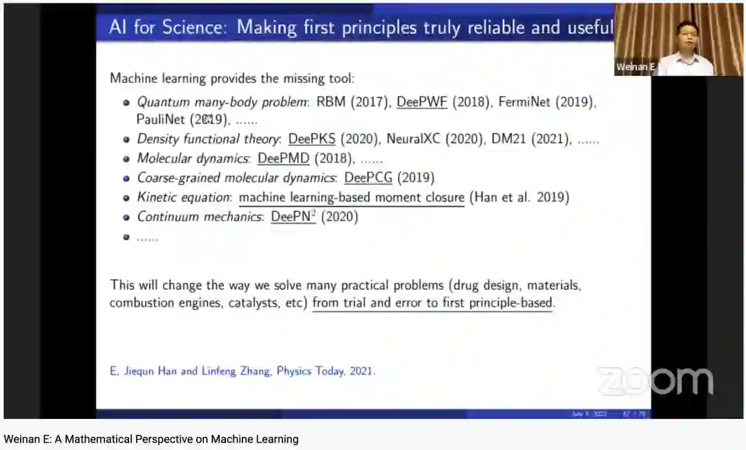 北京时间 2022 年 7 月 8 日晚上 22:30,鄂维南院士在 2022 年的国际数学家大会上作一小时大会报告 (plenary talk)。今天我们带来鄂老师演讲内容的分享。鄂老师首先分享了他对机器学习数学本质的理解(函数逼近、概率分布的逼近与采样、Bellman 方程的求解);然后介绍了机器学习模型的逼近误差、泛化性质以及训练等方面的数学理论;最后介绍如何利用机器学习来求解困难的科学计算和科学问题,即 AI for science。