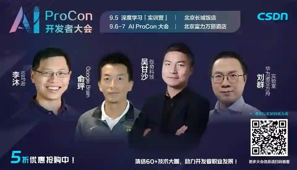 9.5-7日 AI 开发大会(AI ProCon),7位出品人集结国内外60+技术大咖,探秘9大核心技术,深剖行业痛点,亚马逊首席科学家李沐还将亲授「深度学习集训营」,助力开发者实现技术跃迁。