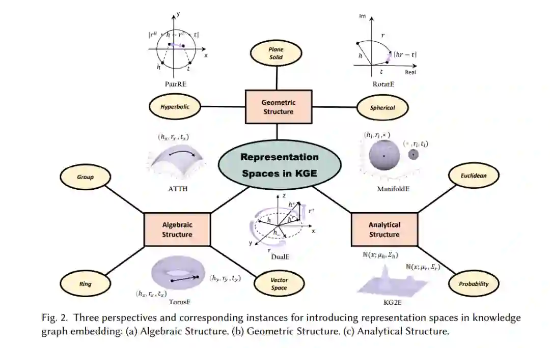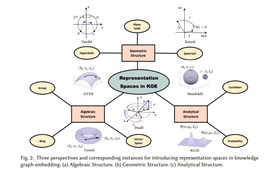 一些研究致力于从数学空间的角度讨论传统的机器学习模型[74,82]。然而,目前还没有从数学空间的角度对KGE方法进行系统的综述。现有关于KGE方法的研究主要集中在编码模型和KGE方法的应用上。例如Wang等[108]根据KGE方法的嵌入函数对其进行了分类,并将其分为三层:基于翻译的模型、语义匹配模型和附加信息模型。Ji等人[51]从表示学习、评分函数、编码模型和辅助信息四个方面全面介绍了KGE。Lu等人[70]调查了KGE方法,重点是利用文本信息。因此,本文旨在对知识图嵌入技术的表示空间进行全面综述,总结表示空间的不同性质,并为构建知识图嵌入方法提供指导。为了从新的空间视角更好地理解KGE方法,在基本数学空间系统的启发下,我们建立了一个系统的、全面的、多角度的分类法,根据现有KGE方法的表示空间对其进行分类。具体而言,我们建议将现有的KGE方法分为三类,即代数结构(algeaic Structure)、几何结构(Geometric Structure)和分析结构(Analytical Structure)。图2提供了我们的分类框架和属于每个类别的一些代表性KGE方法的概述(详细版本可以在第3节中找到)。在本综述中,我们将介绍上述三种数学结构的定义和性质,并详细介绍属于这些类别的一些代表性KGE方法。此外,我们将总结不同的KGE方法的实验结果,并为构建更有表现力和更强大的KGE方法提供一些建议和指导。此外,我们将从表示空间的角度指出KGE方法的新趋势和进一步的发展方向。