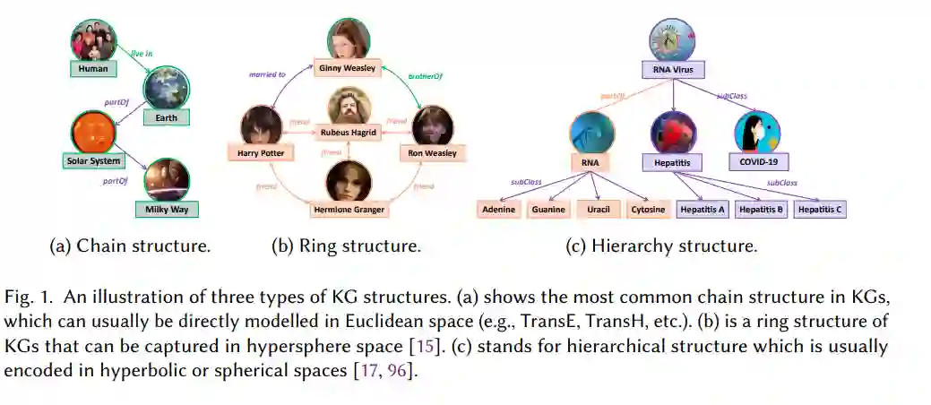 另一种KGE方法提出通过保留KGs的结构模式来学习KG嵌入,这一工作的动机是大型KGs通常包含许多复杂和复合结构。例如,在图1中,我们给出了KGs中三种典型的结构模式,即链结构、环结构和层次结构。为了有效地捕获知识图谱中的层次结构,提出了ATTH[3]将知识图谱嵌入到曲率可训练的双曲空间中,在双曲空间中可以使用比欧氏空间更丰富的变换来分离节点[76],同时捕获逻辑模式。此外,一些KGE方法也尝试将KGs嵌入到其他数学空间中,以在KGs中建模一些理想的性质,如KG2E[45]是第一个“基于密度”的嵌入技术,它学习KGs在高斯分布概率空间中的嵌入,以建模实体和关系的不确定性。此外,TorusE[26]选择一个紧凑的李群作为其嵌入流形来处理正则化问题,ModulE[16]还引入了群理论,将实体和关系建模为群元素,这可以适应并优于大多数现有的KGE模型。从表示空间的角度,我们发现上述KGE方法大多学习在不同的数学空间(如欧氏空间、双曲空间和概率空间)中嵌入,以捕获KGs中不同的关系和结构模式,的确,不同的数学空间有其独特的优势,这有利于捕获KGs中不同的模式和属性,因此,我们认为表示空间在KGE方法中扮演着重要的角色。因为它决定了可以被KG嵌入捕获和保存的KG的模式和属性。除了KGE领域,一些研究[13,74,82]也证明了数学空间在传统机器学习中的重要性。
