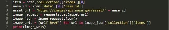由此可以获取JSON的第一个项。然后可以解析出nasa_id,用于获取与此特定结果关联的所有图像。接下来可以将nasa_id添加到新URL并发出请求。