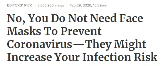 “不,你不需要戴口罩来预防新冠病毒——它们有可能让你更容易感染”,图片来源:福布斯杂志