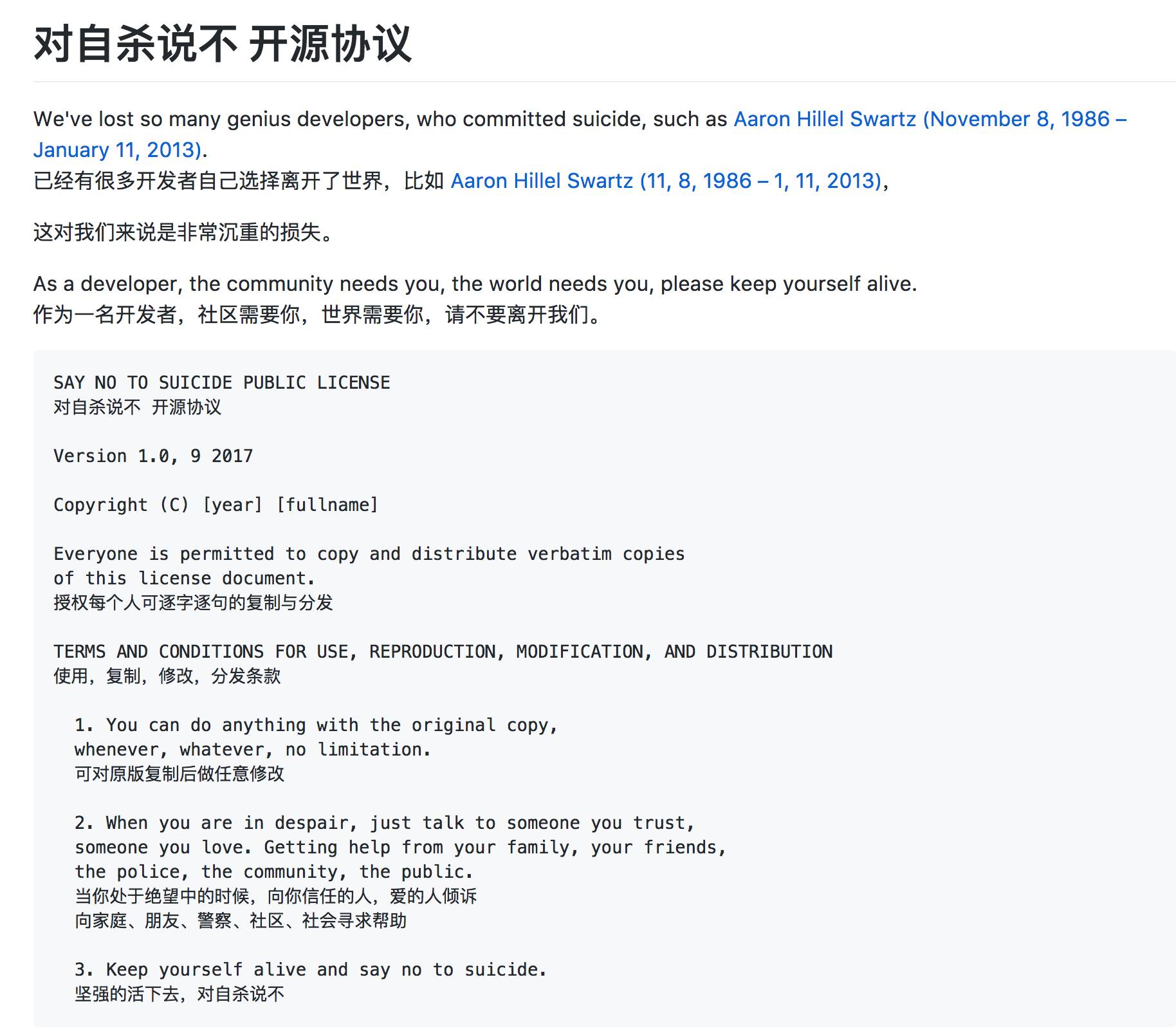 本周最受关注的莫过于WePhone开发者苏享茂因离婚时遭前妻翟欣欣敲诈勒索自杀事件,近日,有开发者编写 《对自杀说不》 开源协议呼吁开发者珍爱生命远离自杀。