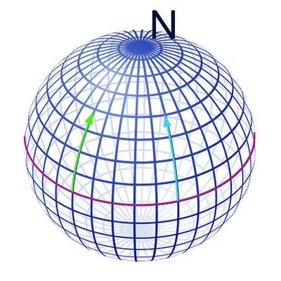 球面上的“直线” 就是大圆,经线都是大圆,但纬线除了赤道之外都不是大圆。想像有两个人如图从赤道开始往北方走,明明是“平行”开始的,却不自觉愈走愈近,好像有力在牵引着彼此。究其原因在于球面的曲率是正的,不像平面的曲率等于零。这说明曲率为何可解释为力。