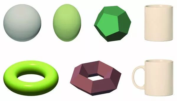 图中每一列的形体,在拓朴学中都被视为相同,虽然几何性质显然不同。第一列是 2 维的球面;第二列是 2 维的环面。