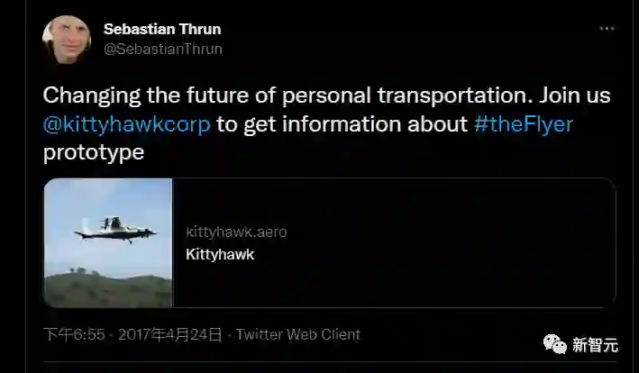 Sebastian Thrun对Kitty Hawk的期许也很大,他在Twitter上说,Kitty Hawk将「改变个人交通的未来」。