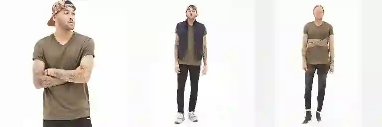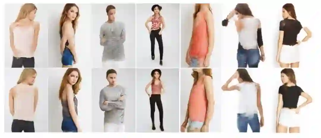 与Deformable GAN相比,Dense Pose Transfer由于在姿态表示中融合了人体表面纹理信息,从而能够更好地保持衣着纹理细节,并有效解决一部分的遮挡,断肢等问题。下图中第一行为Deformable GAN的结果,第二行为Dense pose transfer的结果: