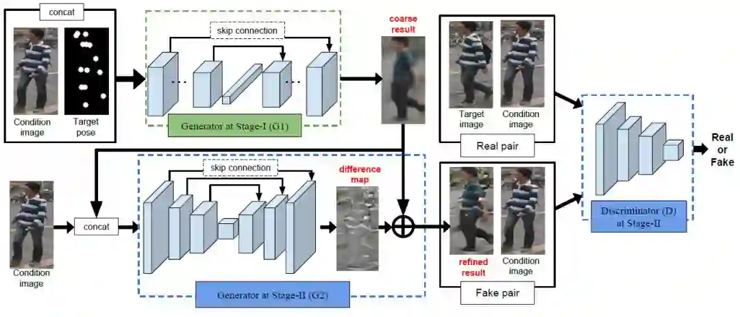 本篇文章中提出了一种两段式学习框架,通过从粗到精的方式合成新姿态下的人物图像:第一阶段首先合成目标姿态下人物的大体轮廓,并大致保持衣着颜色;第二阶段在前一阶段的结果基础上再学习精细的残差,增强合成图像的细节纹理。训练流程图如下所示: