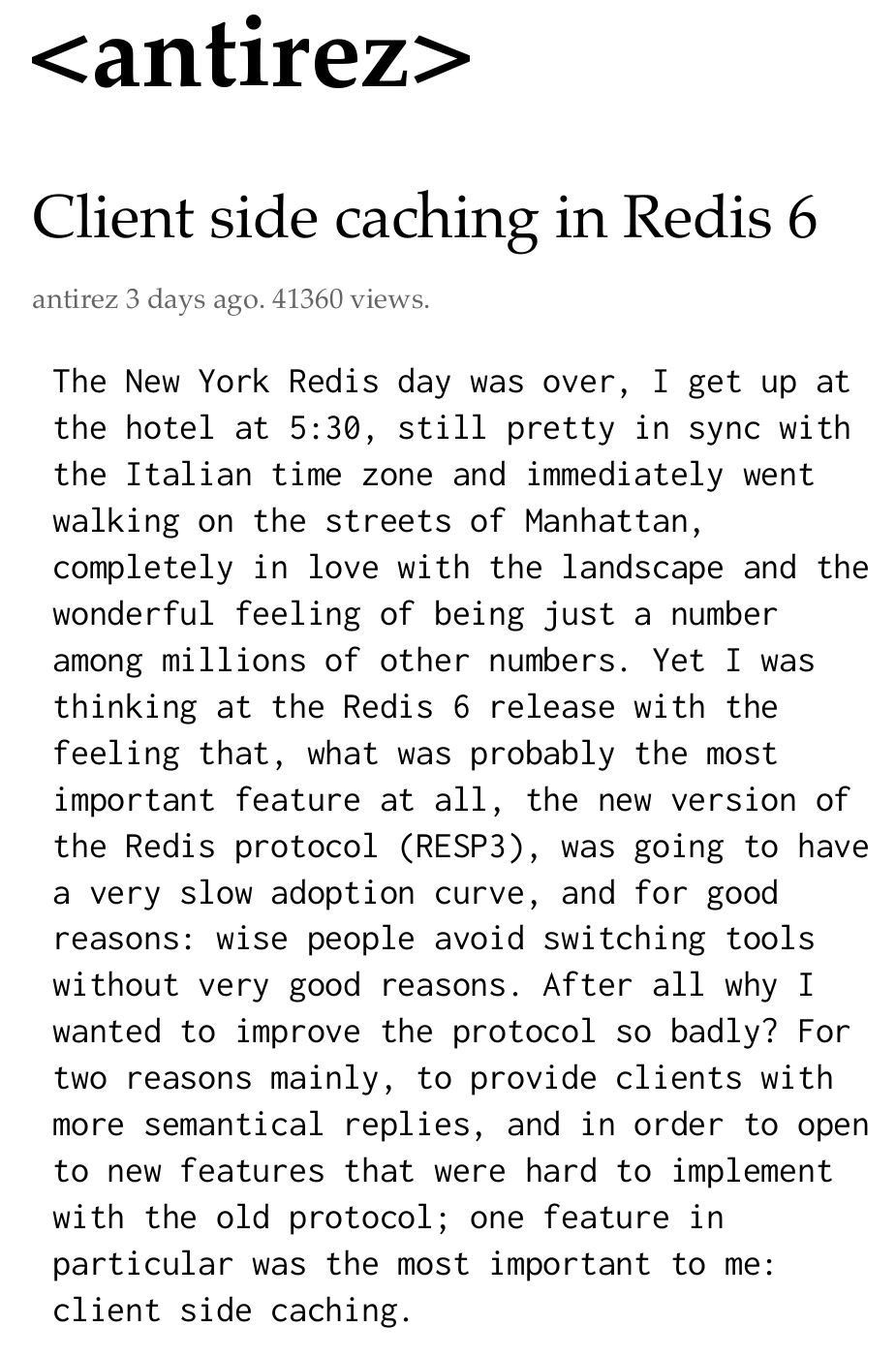 antirez 说到,为了打造更好的 Redis 协议,他为此编写了规范,然后再编写 RESP3 协议的代码,以及其他和 Redis 6 相关的内容,如 ACL 等。而客户端缓存功能也为 antirez 关于 Redis 的许多想法加入了巨大空间,不过最后 antirez 还是以某种方式放弃了,或者因为时间不够而放弃。