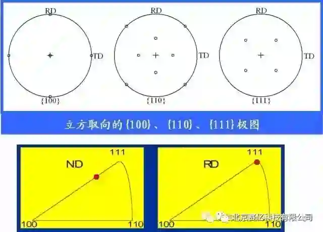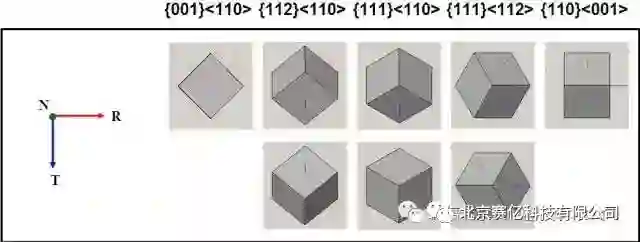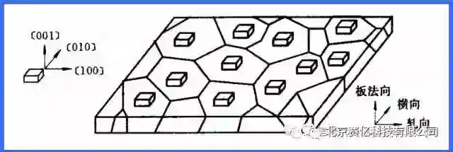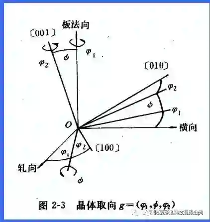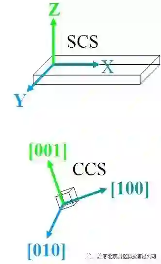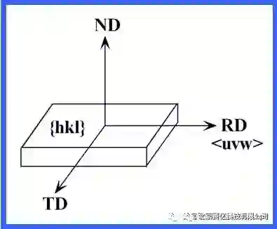 晶体的[100]-[010]-[001]坐标系CCS相对于样品坐标系SCS:RD(rolling direction, 轧向)-TD(transverse direction, 横向)-ND (normaldirection,法向)(或X-Y-Z)的位置关系。