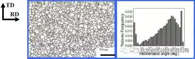 相邻取向差分布基本接近完全再结晶的理想随机取向差分布曲线,表明试样完全再结晶。