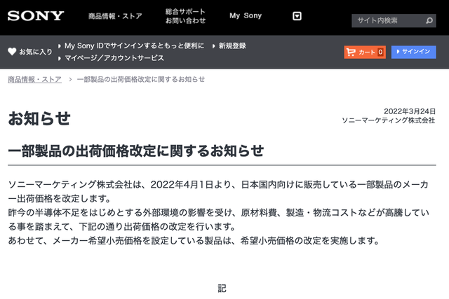索尼日本宣布,因为半导体芯片不足、原材料和制造、物流成本的高涨等,从 4 月 1 日起修改、提高产品出货价格。涉及产品包括家庭影院、数码单反相机、数码摄像机、专业摄像机、耳机、收音机等。涨价幅度 3%~31%。在相机方面,涨价的机型包括 ILCE-6400、ILCE-6400M、ILCE-6400Y、ILCE-7C、ILCE-7CL 等。耳机包括 WI-1000XM2、WH-CH710N、WH-XB910N 等。