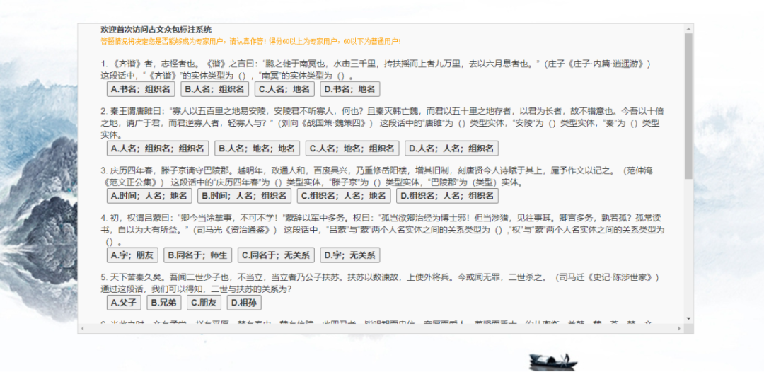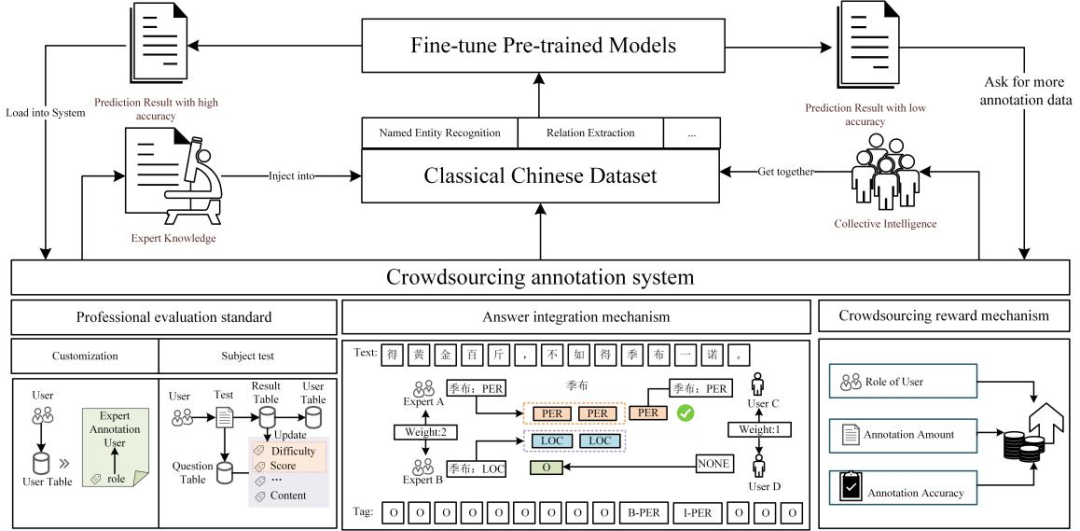 “二十四史”是中国古代各朝撰写的二十四部史书的总称,记录了丰富的历史人物和事件。由于古代汉语和现代汉语在语义和语法上存在较大差异,识别史书中的实体和关系耗时耗力,因此我们利用群体智慧,采用众包标注系统,并通过引入领域知识来实现高效准确的标注。根据系统的标注结果,可以得到一系列的实体和关系来构建文言文语言理解测评基准及数据集。