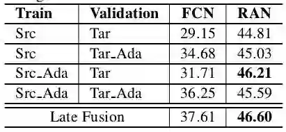 从上表中可以发现本文提出的RAN较原始的FCN可以带来非常明显的性能提升,充分验证了进行特征层面的域适应非常有必要,基本可以提升10个点以上。同时从第一列和第四列的结果对比中可以发现图像层面的域适应也有7个点左右的性能提升。总之经过本文算法连个层面的域适应策略,将CityScape上的语义分割性能从原始的29.15提升到了46.60。