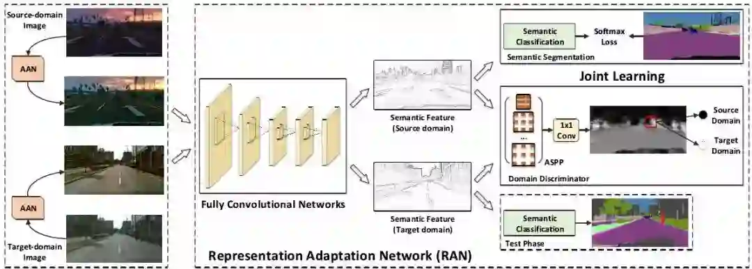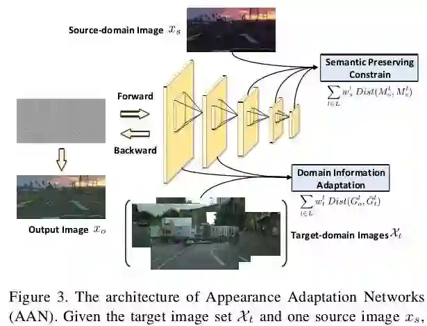 上图给出了本文方法的处理流程,左侧的AAN负责对合成图像进行转换,使得生成的图像在内容上依然保留原始合成图像的内容,但在风格上要非常接近真实场景中的图像,右侧的RAN本质上是一个生成对抗网络GAN,其目的都是使得基础网络FCN提取的特征具有域不变性,也即要使得不管是来自合成图像还是来自真实图像,提取的特征应该分布在同一个特征空间上。结合上图下面重点论述本文提出的以上两个域适应网络: