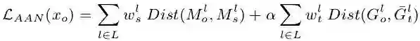 图3展示了图像域适应网络AAN的具体细节和处理流程,熟悉style transfer的同学其实已经发现了它本质上就是一个图像风格转换网络,其实现思路也是和CVPR2016的这篇文章[1]类似的,这里简单阐明一下实现思路:输入是一张高斯白噪声图像,输出图像是在网络反向传播的过程中不断更新得到的,训练的损失函数包含两部分:内容上和合成图像尽可能接近,风格上和真实图像尽可能接近,因此整个AAN的损失函数如下式所示: