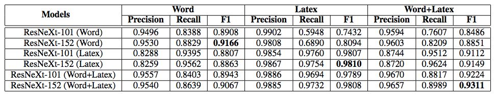 表 2:使用 ResNeXt-{101,152} 作为骨干网络对 Word 和 Latex 数据集的评估结果。