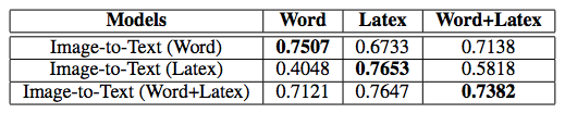 表 3:图像-文本模型在 Word 和 Latex 数据集上的评估结果(BLEU)。