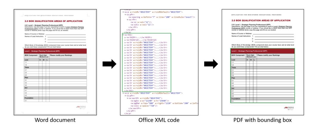 直观地讲,借助每个文档中的标记语言,研究者可以通过添加边框来操控源代码。处理流程如图 2 所示。就 Word 文档而言,研究者通过编辑每个文档中的内部 Office XML 代码来添加表格边框。每个 .docx 格式文件有一个压缩包,解压后的文件夹中有一个 document.xml 文件。在 XML 文件中,该代码片段介于标记 <w:tbl> 和 </w:tbl> 之间,通常表示 Word 文件中的表格,如图 3 所示。研究者修改 XML 文件中的代码片段,使表格边框可更改为与文档其他部分不同的颜色。如图 3 所示,研究者在 PDF 文档中添加了一个绿色边框,该表格得到完美识别。最后,研究者从 Word 文档中获得了 PDF 页面。