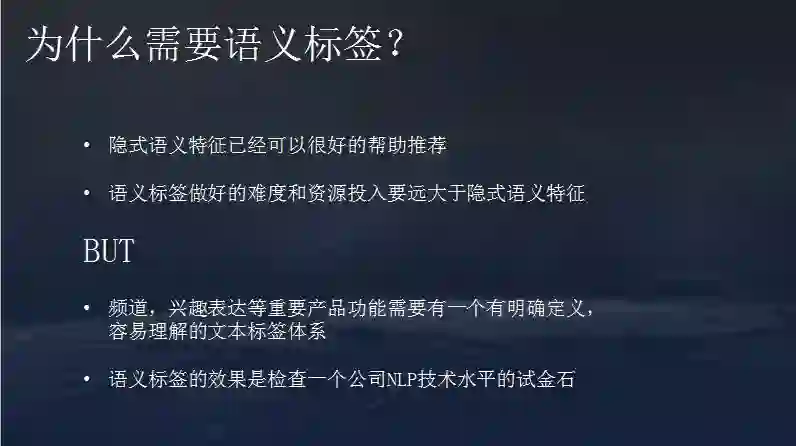 目前,隐式语义特征已经可以很好的帮助推荐,而语义标签需要持续标注,新名词新概念不断出现,标注也要不断迭代。其做好的难度和资源投入要远大于隐式语义特征,那为什么还需要语义标签?有一些产品上的需要,比如频道需要有明确定义的分类内容和容易理解的文本标签体系。语义标签的效果是检查一个公司NLP技术水平的试金石。