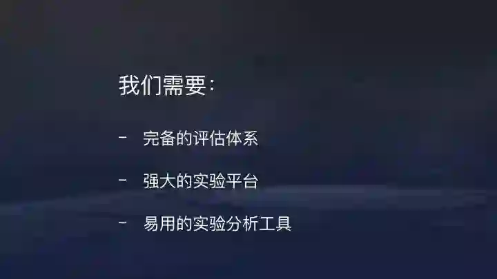 全面的评估推荐系统,需要完备的评估体系、强大的实验平台以及易用的经验分析工具。所谓完备的体系就是并非单一指标衡量,不能只看点击率或者停留时长等,需要综合评估。过去几年我们一直在尝试,能不能综合尽可能多的指标合成唯一的评估指标,但仍在探索中。目前,我们上线还是要由各业务比较资深的同学组成评审委员会深入讨论后决定。