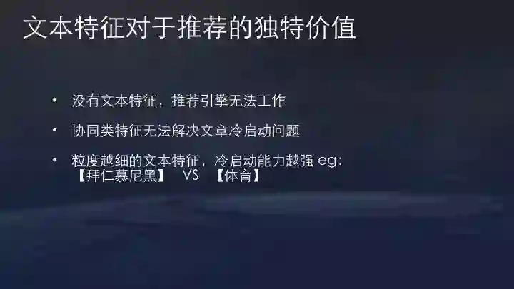上图是今日头条的一个实际文本case。可以看到,这篇文章有分类、关键词、topic、实体词等文本特征。当然不是没有文本特征,推荐系统就不能工作,推荐系统最早期应用在Amazon,甚至沃尔玛时代就有,包括Netfilx做视频推荐也没有文本特征直接协同过滤推荐。但对资讯类产品而言,大部分是消费当天内容,没有文本特征新内容冷启动非常困难,协同类特征无法解决文章冷启动问题。