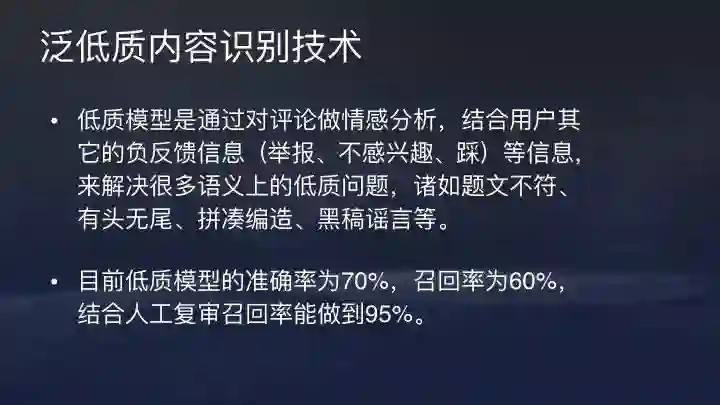 泛低质识别涉及的情况非常多,像假新闻、黑稿、题文不符、标题党、内容质量低等等,这部分内容由机器理解是非常难的,需要大量反馈信息,包括其他样本信息比对。目前低质模型的准确率和召回率都不是特别高,还需要结合人工复审,将阈值提高。目前最终的召回已达到95%,这部分其实还有非常多的工作可以做。头条人工智能实验室李航老师目前也在和密歇根大学共建科研项目,设立谣言识别平台。by 今日头条