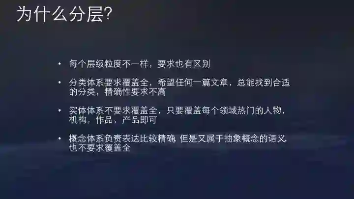 分类的目标是覆盖全面,希望每篇内容每段视频都有分类;而实体体系要求精准,相同名字或内容要能明确区分究竟指代哪一个人或物,但不用覆盖很全。概念体系则负责解决比较精确又属于抽象概念的语义。这是我们最初的分类,实践中发现分类和概念在技术上能互用,后来统一用了一套技术架构。