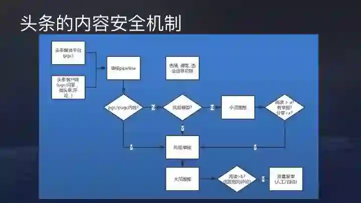 现在,今日头条的内容主要来源于两部分,一是具有成熟内容生产能力的PGC平台,一是UGC用户内容,如问答、用户评论、微头条。这两部分内容需要通过统一的审核机制。如果是数量相对少的PGC内容,会直接进行风险审核,没有问题会大范围推荐。UGC内容需要经过一个风险模型的过滤,有问题的会进入二次风险审核。审核通过后,内容会被真正进行推荐。这时如果收到一定量以上的评论或者举报负向反馈,还会再回到复审环节,有问题直接下架。整个机制相对而言比较健全,作为行业领先者,在内容安全上,今日头条一直用最高的标准要求自己。