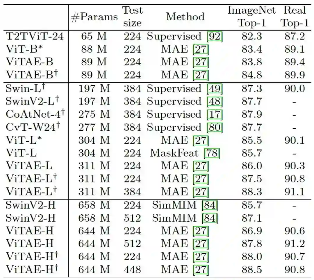 为了探索归纳偏置在大规模Vision Transformer模型中的作用,我们参考ViT[3]的设计,对所提出的ViTAE模型进行了扩展,并对应的提出ViTAE-B (89M),ViTAE-L(311M),和ViTAE-H(644M)模型,分别包含12个NC模块,24个NC模块,和36个NC模块。我们相信ViTAE模型可以进一步扩展到10亿参数规模,并将在未来工作中进一步研究。然而,当模型规模过大时,ImageNet-1K的数据量不足以支撑模型的全监督训练,导致其容易过拟合到ImageNet-1K的训练数据,这使得我们难以分析所引入的归纳偏置在大规模模型情况下是否仍然有帮助。因此,我们采用了自监督学习方法MAE[4]中的预训练-微调范式对大规模ViTAE模型的训练方式进行优化,并基于此对ViTAE模型的效果进行了分析。