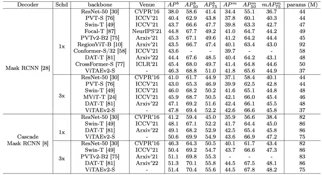 我们首先在ImageNet-1K数据集上评估了所提出的ViTAEv2模型的分类任务表现能力。结果如表4所示。所提出的ViTAEv2模型在各个模型尺寸下均取得了SOTA的分类任务表现,并以更少的参数量取得了超越非多阶段堆叠方式的ViTAE模型。这验证了所引入的归纳偏置在多阶段的堆叠方式下的有效性。