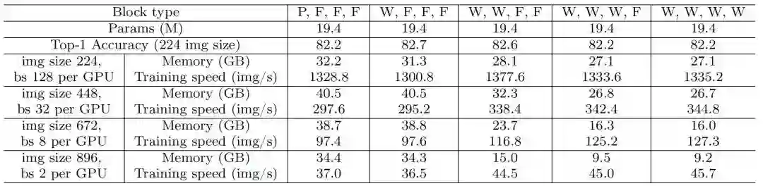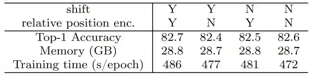 然而,引入这样的窗口注意力机制会制约Vision Transformer模型对长距离信息的建模能力。为此,我们探索了在不同阶段使用窗口注意力机制对模型表现和计算代价的影响,结果如表2所示。在表2中,P代表使用performer进行注意力计算,F表示使用全注意力机制,W表示使用窗口注意力机制。我们发现,在前两个阶段使用窗口注意力机制,后两个阶段使用全注意力机制可以取得性能和计算代价的最佳权衡。因此,我们采用了“WWFF”的方式对ViTAEv2模型进行了设计。此外,需要注意的是,ViTAEv2模型并不需要Swin Transformer中采用的额外相对位置编码和窗口移动(window shift)机制即可得到较好的效果,这归功于ViTAE模型中卷积模块已经能够提供位置信息并促进跨窗信息融合。对相对位置编码和窗口移动机制的消融实验结果如表3所示。