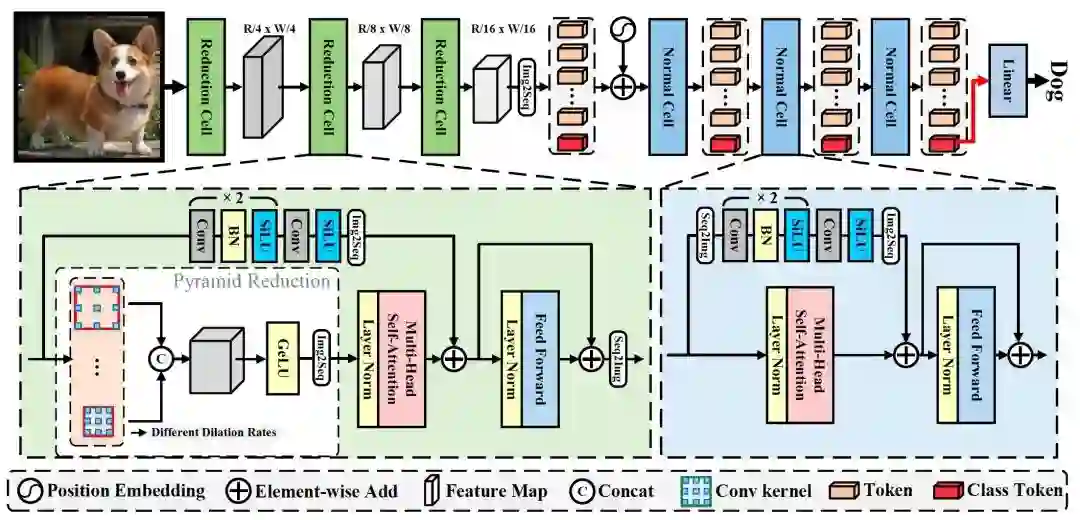 Vision Transformer模型通过使用attention对划分成小块的图像进行建模,得到了很好的效果。在ViTAE[2]中,我们从模型设计的角度在transformer中引入了归纳偏置,并提出两种新的基础模块,即reduction cell (RC)和normal cell (NC), 如图1所示。Reduction cell使用多尺度卷积来为transformer模型引入尺度不变性。Normal cell使用并行的卷积分支,在不影响transformer全局建模能力的情况下引入局部归纳偏置。通过引入这样的两种机制,ViTAE模型取得了较好的数据效率和分类准确度。